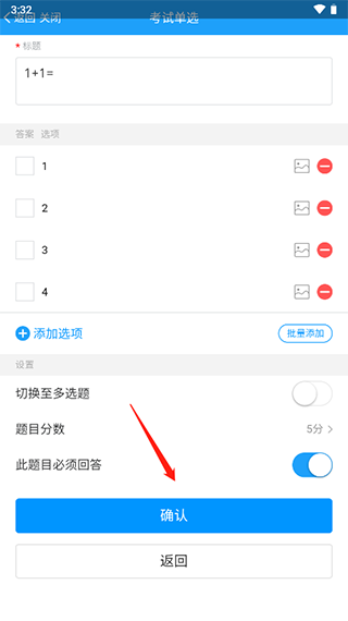 6、填寫(xiě)標(biāo)題、答案選項(xiàng),例如1+1等于幾,用戶可以自由填寫(xiě)答案,設(shè)置分值等信息,點(diǎn)擊確認(rèn)