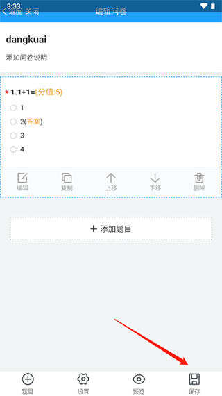 8、依次輸入問(wèn)卷標(biāo)題和答案選項(xiàng),添加完成后點(diǎn)擊保存
