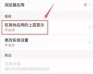 5、然后進(jìn)入到手機(jī)應(yīng)用設(shè)置頁面,點(diǎn)開頁面里的 在其他應(yīng)用的上層顯示。