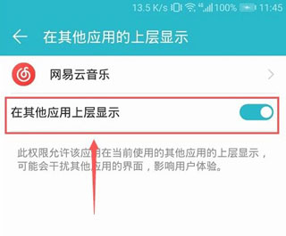 6、然后把頁面里的在其他應(yīng)用的上層顯示開啟即可。