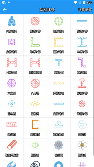 2、我們進入到型材計算功能里面,里面又包含了很多的計算模式,都能夠很精確的幫助您計量,轉(zhuǎn)換數(shù)據(jù)。接下來可以隨便進入一個計算類型,小編為您演示的是特材計算。