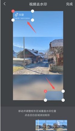 第四步:視頻水印被矩形區(qū)域完全覆蓋后,點(diǎn)擊視頻右上角的“完成”,等待視頻水印去除后,自動(dòng)跳轉(zhuǎn)視頻保存頁(yè)面。