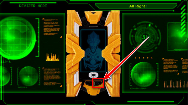 4、點(diǎn)擊終端下面右邊的藍(lán)色半邊按鈕,然后按鈕會(huì)變成黑色,艾克斯奧特曼也會(huì)出現(xiàn)在屏幕上!