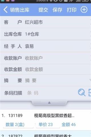 3、回到單據(jù)主體界面,如果需要單據(jù)打印,點(diǎn)打印即可,注意,需要藍(lán)牙連接藍(lán)牙小票打印機(jī)。點(diǎn)保存,是保存在手機(jī)端本地的。點(diǎn)提交,可以將單據(jù)傳送到管家婆系統(tǒng)中,生成銷售單草稿。如果物聯(lián)通后臺(tái)開啟了單據(jù)過帳,單據(jù)將過帳,進(jìn)入經(jīng)營歷程中。