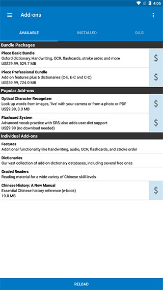 5、pleco為用戶提供了兩個(gè)免費(fèi)的內(nèi)置詞典,如果您需要擴(kuò)展,選擇“add-nos”進(jìn)行語種選擇即可,有付費(fèi),也有免費(fèi)的提供