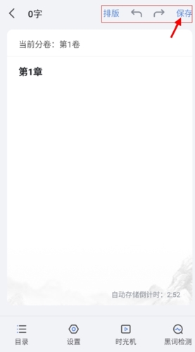 不少人寫作到一半可能有事情中斷,害怕內(nèi)容丟失,小編帶大家看看小黑屋的保存功能。在寫小說頁面的右上角,用戶可以輕點(diǎn)保存,確保內(nèi)容不會(huì)丟失,排版功能則是將文章中的一些空位補(bǔ)齊、文字對(duì)其等,讓小說整體更加美觀。