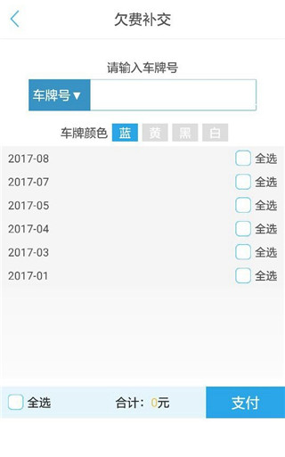 3、若忘記支付停車(chē)費(fèi),則點(diǎn)擊“欠費(fèi)補(bǔ)交”,輸入車(chē)牌號(hào)后即可查詢到車(chē)主的所有欠費(fèi)信息;