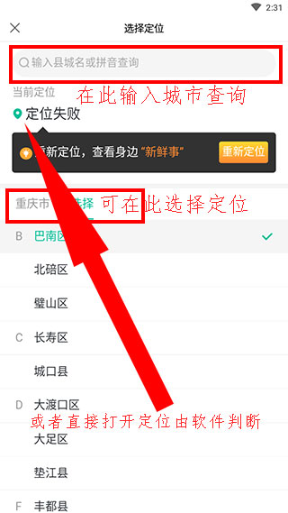 2、點擊上方選擇定位或者自行輸入城市定位這里以巴南為例