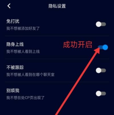 4、進(jìn)入到隱私設(shè)置界面后,我們?cè)倩瑒?dòng)隱身上線后面的滑塊至亮色。