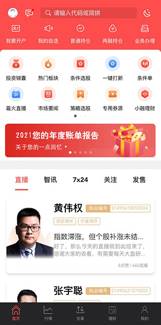 1、在本站下載華融證券手機版并打開2、首頁一欄有投資錦囊、熱門板塊、年度賬單、最火直播等板塊供用戶查看,同時還可以進行賬號開戶,自選股票等。