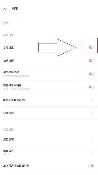 3、找到并關(guān)掉"水印設(shè)置",這樣拍出來(lái)的照片就沒(méi)有水印啦