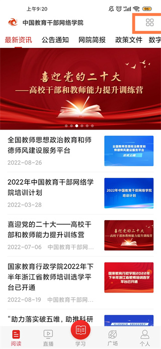 2、【閱讀】中查看公告通知、簡報(bào)、政策文件等內(nèi)容,通過右上角按鈕,可切換平臺。
