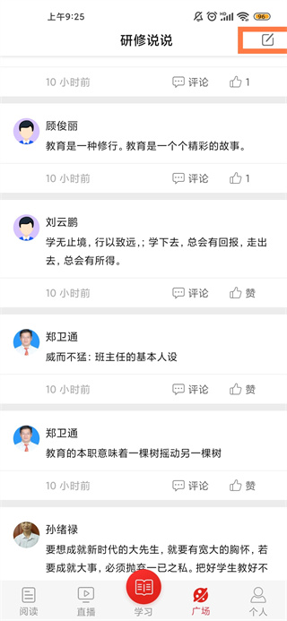 5、點(diǎn)擊下方導(dǎo)航中【廣場】菜單,可查看所有學(xué)員發(fā)表的學(xué)習(xí)感言與收獲;可評論,點(diǎn)贊感興趣的說說;右上角撰寫按鈕可撰寫發(fā)布感想收獲。