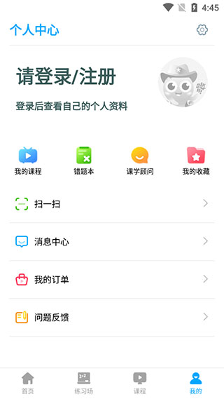 1、下載安裝之后打開學(xué)魁榜APP,打開軟件后,點(diǎn)擊【我的】——頭像進(jìn)行賬號(hào)登錄注冊(cè),同時(shí)在這里可以看到我的課程、錯(cuò)題本等板塊;