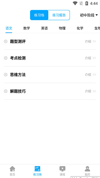 3、在【練題場(chǎng)】板塊,這里有初高中語文、數(shù)學(xué)英語等九門學(xué)科的試題,包括題型測(cè)評(píng)、考點(diǎn)檢測(cè)、思維方法、解題技巧,點(diǎn)擊右上角即可切換初中和高中;