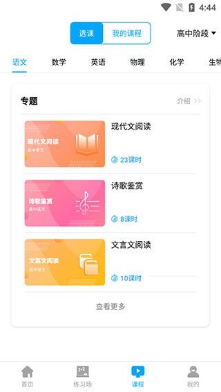 4、在【課程】板塊,擁有高中語文、數(shù)學(xué)英語等九門學(xué)科的課程視頻和課件,并且每一門學(xué)科都有相對(duì)應(yīng)的試題板塊。