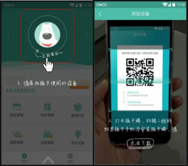 2、注冊成功后,請先綁定學生設備,具體為“點我添加”,然后出現(xiàn)掃描器進行掃描。