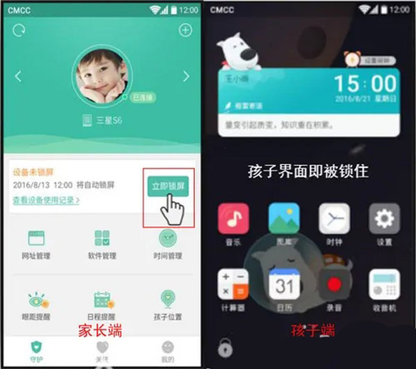 4、綁定完成后,可點擊相應功能,鎖屏:家長點擊-“鎖屏”界面即被鎖住。
