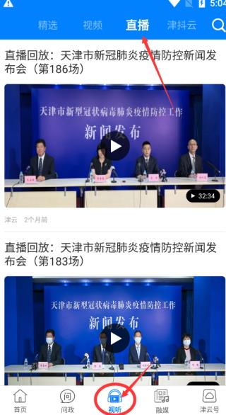 點擊功能欄里面的“視聽”,選擇上方“直播”便有各場防疫新聞的回放在線觀看了!