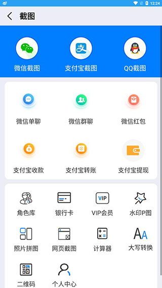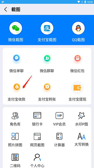 3、進(jìn)入后可以看到里面有多種截圖類型,比如微信、支付寶、QQ等等;