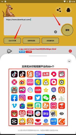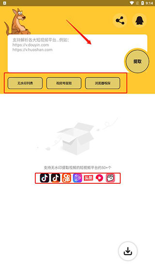 2、如果你想要提取短視頻平臺(tái)中無水印的視頻就可以點(diǎn)擊無水印列表,然后復(fù)制視頻連接粘貼至搜索框中,點(diǎn)擊提取就可以提取無水印視頻了,支持50+個(gè)短視頻平臺(tái);
