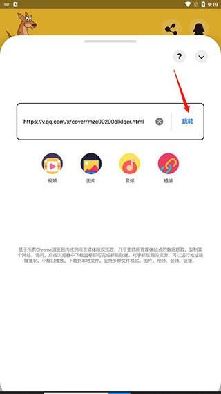 4、想要提取更多的內(nèi)容,比如視頻、圖片、音頻之類的就可以點(diǎn)擊瀏覽器嗅探,然后就可以把想要觀看的視頻復(fù)制這里跳轉(zhuǎn)就可以打開;