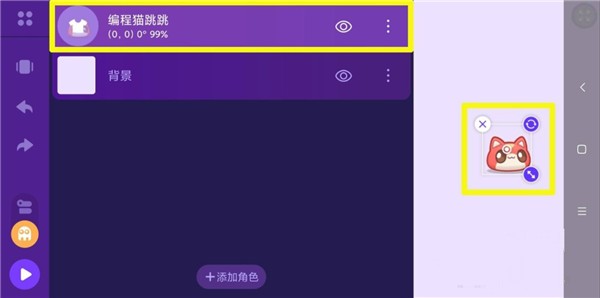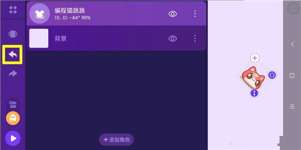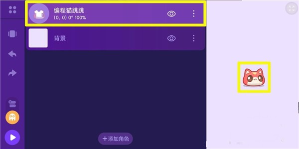 1、運(yùn)行點(diǎn)個(gè)貓app,打開(kāi)作品,進(jìn)入創(chuàng)作界面。可以看到除了背景,已經(jīng)有一個(gè)角色:"編程貓?zhí)?quot;。