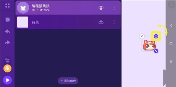 3、點(diǎn)住方框右上角的旋轉(zhuǎn)標(biāo)志,滑動(dòng)手指,"編程貓?zhí)?quot;就會(huì)隨著旋轉(zhuǎn)了。