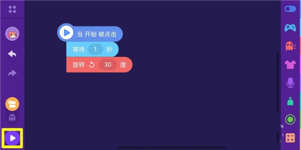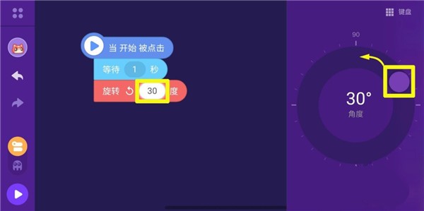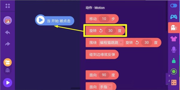 6、把動(dòng)作積木盒中的積木"旋轉(zhuǎn)30度"拉到編輯區(qū),放到積木"當(dāng)開(kāi)始被點(diǎn)擊"下方,自動(dòng)拼接起來(lái)。
