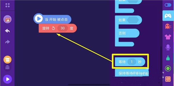 7、為了看清編程貓?zhí)淖兓?,添加控制積木盒中的"等待1秒"到"當(dāng)開(kāi)始被點(diǎn)擊"和"旋轉(zhuǎn)30度"之間。
