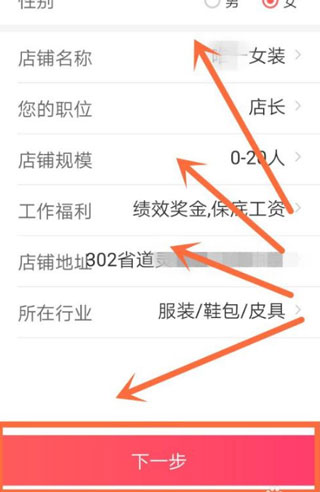 4、進(jìn)入后,編輯【店鋪名稱、店鋪規(guī)模和店鋪地址等相關(guān)信息】,并點擊【下一步】進(jìn)入。如下圖所示。