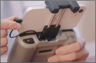 從遙控器底部取出并安裝搖桿,從支架凹槽內(nèi)取出遙控器轉(zhuǎn)接線。拉伸移動(dòng)設(shè)備支架并卡好手機(jī)(接口朝右)位置后,將轉(zhuǎn)接線連接移動(dòng)設(shè)備。