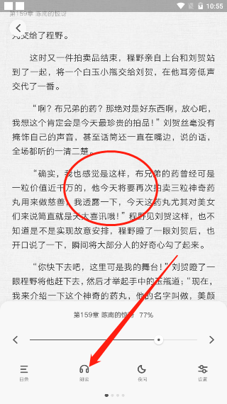 2、進入到小說閱讀界面之后,點擊手機的屏幕中心,在下方就能夠看見“朗讀”的功能并點擊即可以開啟聽小說功能