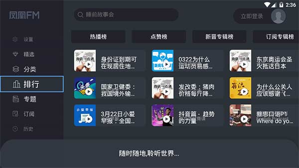 4、類別全面:鳳凰FM擁有新聞、財經(jīng)、公開課、有聲書、談話、娛樂、相聲、文史軍事、親子、社會、生活等海量內(nèi)容。