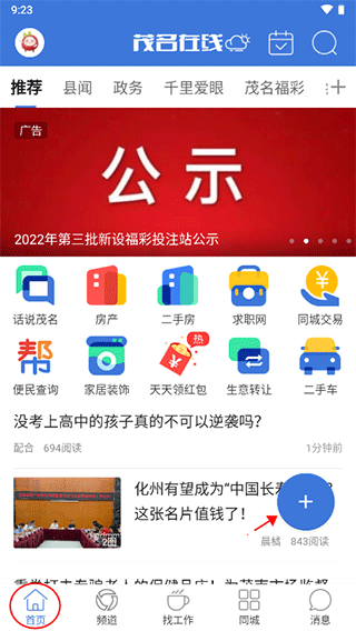 1、下載安裝后打開茂名在線APP,選擇“首頁”模塊右邊的“+”可以在APP內(nèi)發(fā)布帖子