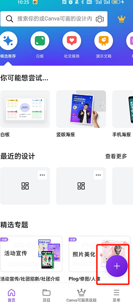 1、打開canva可畫后,我們點(diǎn)擊界面中的【+】,就能進(jìn)入到選擇的界面,如圖所示: