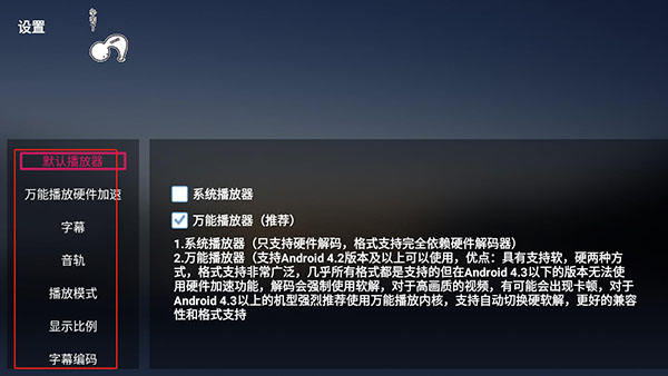 3、在設置中還可以設置播放器、字幕、音軌、播放模式、顯示比例、字幕編碼等等。