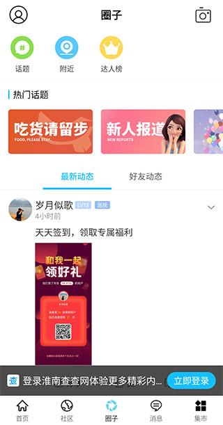 我們還能看到其他用戶發(fā)表的各類動(dòng)態(tài)和話題,如吃貨請(qǐng)留步、新人報(bào)道等。