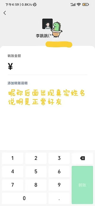 如果好友昵稱(chēng)后面沒(méi)有出現(xiàn)真實(shí)姓名,則需要我們進(jìn)行“假轉(zhuǎn)賬”,進(jìn)一步確認(rèn)與好友之間的關(guān)系。