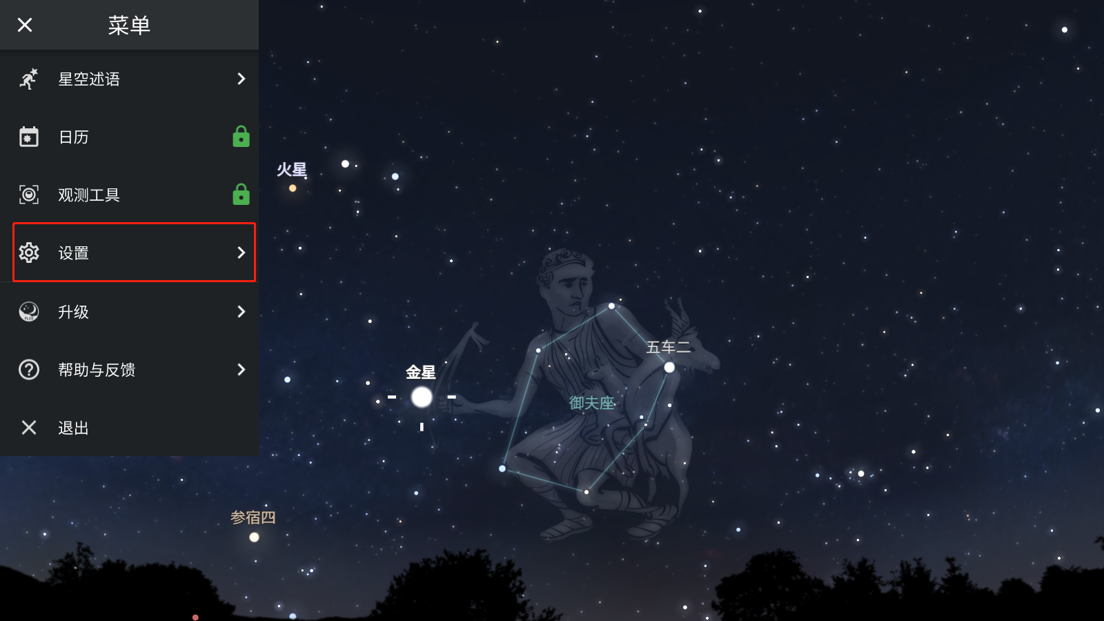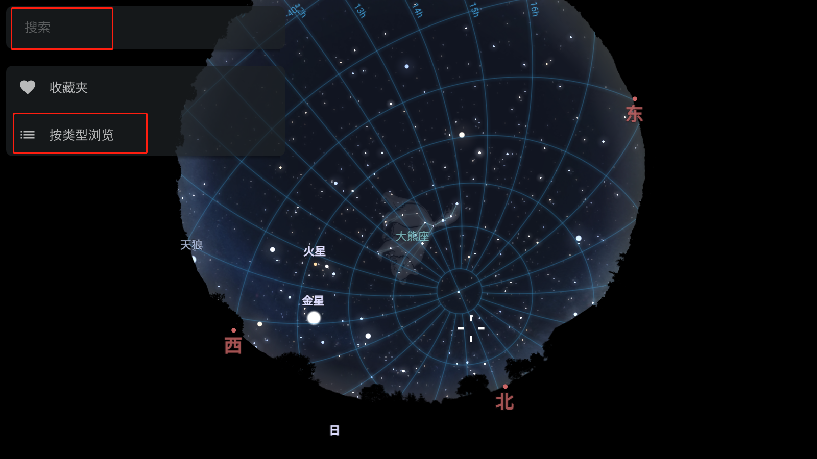 2、就可以顯示網(wǎng)格和線條、星座、地景、大氣層、標(biāo)簽,還可以設(shè)置夜間模式;