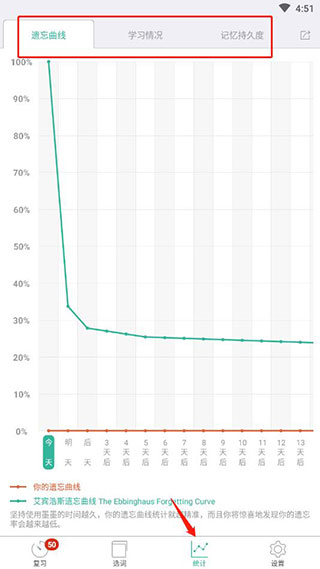 7、各位在統(tǒng)計中可以看到遺忘曲線、學習情況、記憶持久度等來掌握你的學習情況;