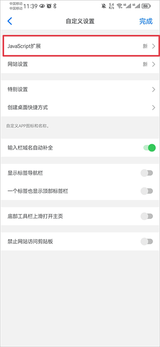 4、然后在自定義設(shè)置頁面中點(diǎn)擊javascript擴(kuò)展功能