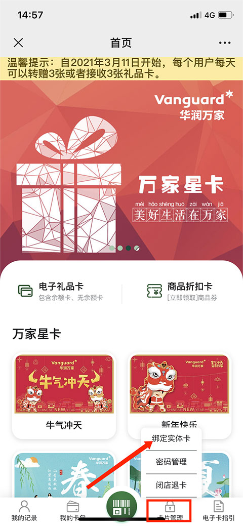 3、點擊右下角“卡片管理”,然后選擇“綁定實體卡”選項,