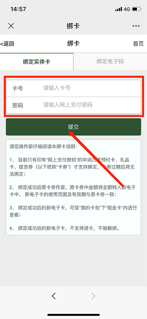 4、進入綁卡界面,填寫“卡號”和“密碼”后,選擇“提交”即可綁定購物卡。