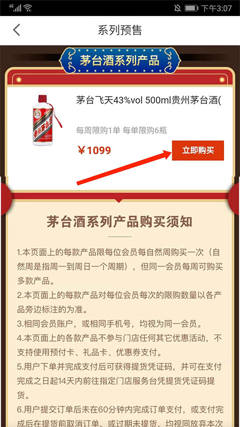 4、確認好茅臺信息后,選擇“立即購買”即可搶購茅臺。