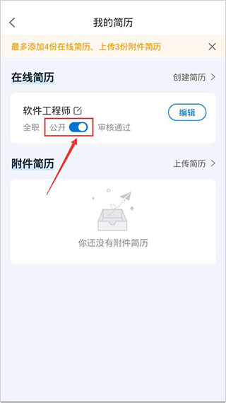 3、然后點擊簡歷卡片上的【開關(guān)】按鈕,即可將公開狀態(tài)切換為隱藏狀態(tài)。