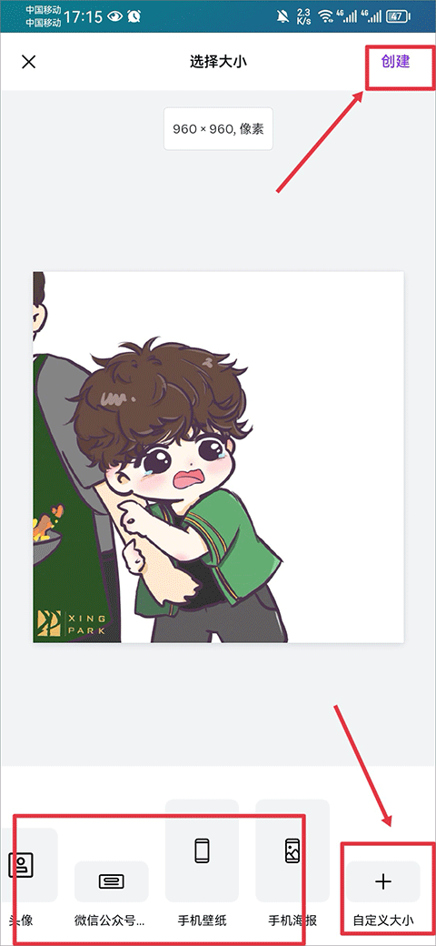 3、在相冊中選擇照片后,接著選擇圖片的大小,若下方大小不合適時,可以點擊自定義大小,大小選擇完成后點擊創(chuàng)建即可