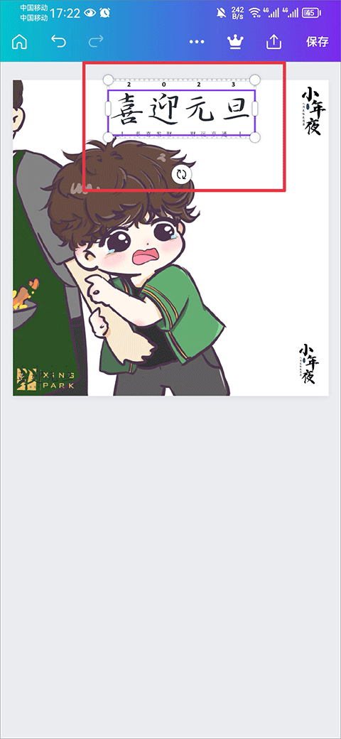 3、點擊后就可以在圖片中看到該文字了,然后點擊文字可以調(diào)節(jié)大小和移動位置