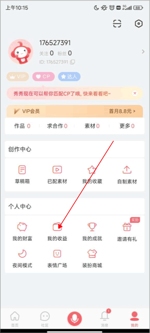 2、在個人中心找到我的收益并且點擊,其中還包括了我的財富,我的成就,邀請有禮,夜間模式,表情廣場和裝扮商城。