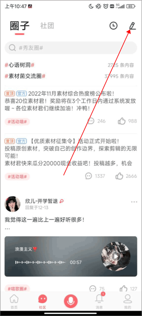 2、點擊右上角的圖案即可發(fā)帖,但是需要用戶到達五級才能發(fā)帖。